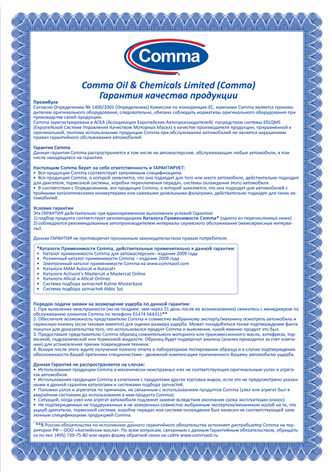 Порядок обращения по Гарантийному Обязательству на территории РФ: 1. При выявлении неисправности (но не позднее, чем через 21 день после ее возникновения) свяжитесь с дистрибьютором Comma на территории РФ ООО «Английские масла» по телефону (495) 739-75-80 или через форму обратной связи на сайте www.commaoil.ru 2. Согласуйте с представителем ООО «Английские масла» кандидатуру эксперта, который проведет экспертизу и определит размер ущерба. 3. Во избежание недоразумений, укажите представителю ООО «Английские масла», на основе каких рекомендаций (какой каталог или какая система подбора автозапчастей) Вы выбрали продукт Comma для использования в Вашем автомобиле. 4. Предоставьте представителю ООО «Английские масла» образец сомнительного моторного или трансмиссионного масла, антифриза, гидравлической или тормозной жидкости (передайте в офис компании в Московской области или отправьте курьерской почтой за счет получателя). 5. Поскольку для проведения тщательного лабораторного анализа экспертам Comma необходимо знать примерную дату выпуска и номер партии товара, вместе с образцом продукции отправьте упаковку из-под нее, четкую фотографию упаковки или чек из магазина, в котором Вы приобрели наш продукт. 6. После этого ждите получения полного отчета о лабораторном тестировании образца. В случае, если тестирование подтвердит несоответствие образца декларируемым нормам, представители ООО «Английские масла» немедленно свяжутся с Вами для согласования порядка выплаты компенсации. FAQ 1. Имеет ли смысл обращаться за компенсацией по Гарантии, если я не сохранил упаковку из-под сомнительного продукта? Да. Просто укажите на это обстоятельство при первом разговоре с нашим специалистом – возможно, учитывая особенности именно этого продукта, тестирование можно провести и не зная номера партии. 2. Каким образом происходит выбор эксперта? Не получится ли так, что ближайший одобренный Вами эксперт окажется за тысячу километров от города, в котором я живу? Обычно в качестве эксперта выбирается ближайший к Вам автосервис, авторизованный компанией - производителем Вашего автомобиля. Если в Вашем городе или области такого автосервиса нет – мы рассматриваем другие варианты. Поверьте, гнать машину на экспертизу из Владивостока в Калининград Вам не предложат ни в коем случае! 3. Сколько сомнительного масла или антифриза нужно отправлять в качестве образца? Обычно для полного исследования требуется примерно 0,5 л продукта. Те жидкости, которые используются в меньшем объеме (например, тормозную жидкость), предоставьте в максимально доступном объеме. 4. Я выбирал продукт не по каталогу. Могу я в таком случае обратиться за компенсацией по Гарантии? Обращайтесь в любом случае. Во-первых, возможно, Ваш выбор совпал с рекомендацией каталога. Во-вторых, если причина полученной неисправности – неправильный выбор продукта, наши специалисты подробно объяснят Вам, как подобрать для Вашего автомобиля подходящий продукт, и в будущем Вы сможете избежать повторения ошибки. | ||||